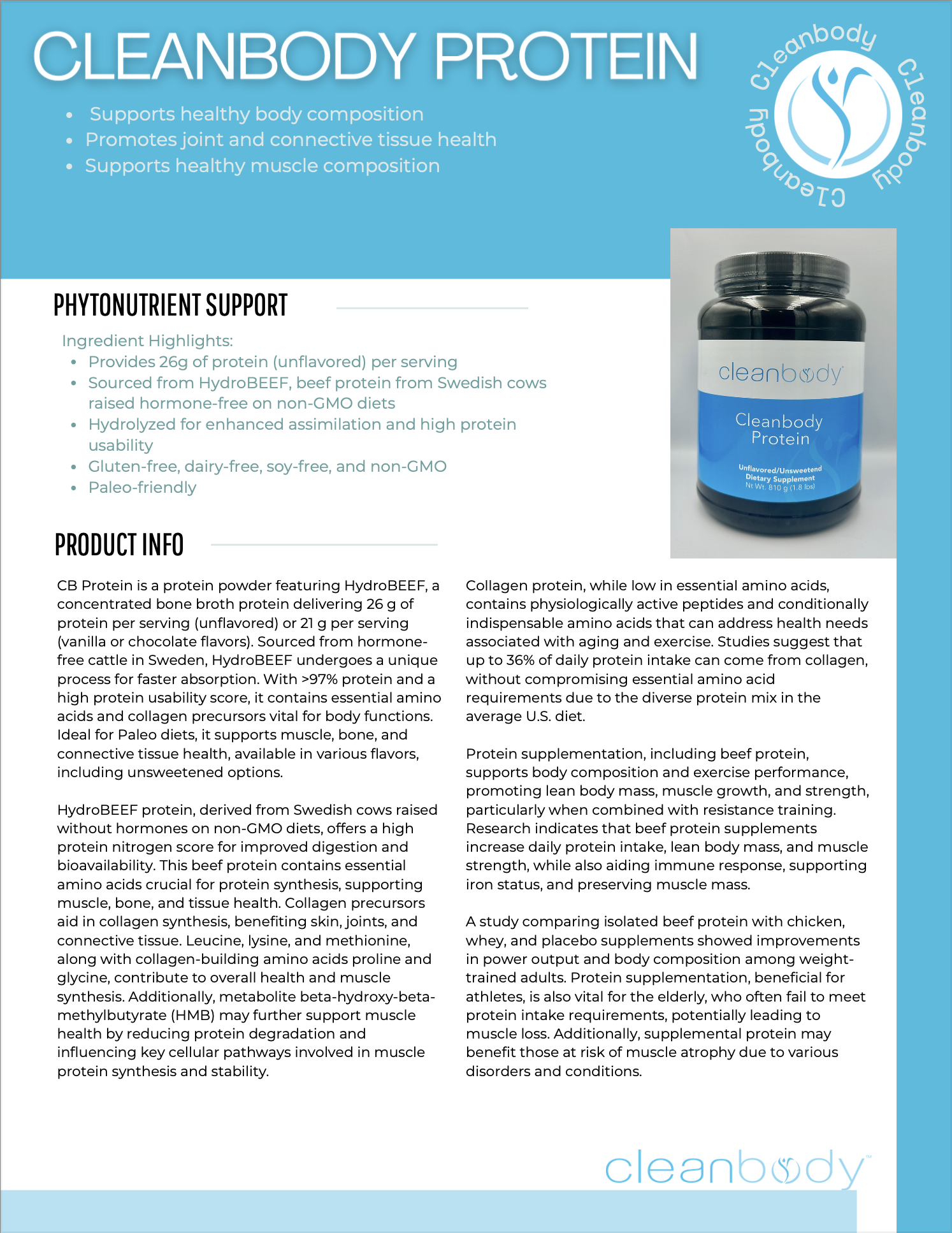 Cleanbody Protein is a great-tasting, dairy-free protein powder, yielding 26 grams of protein per serving. It contains HydroBEEF™, a highly concentrated, pure beef protein, produced through an exclusive proprietary process that allows the protein to be hydrolyzed into more peptides, resulting in easier absorption and assimilation. This product contains beef from animals raised in Sweden without hormones or antibiotics, and it is non-GMO and free of grains, grasses, and/or ensilage.