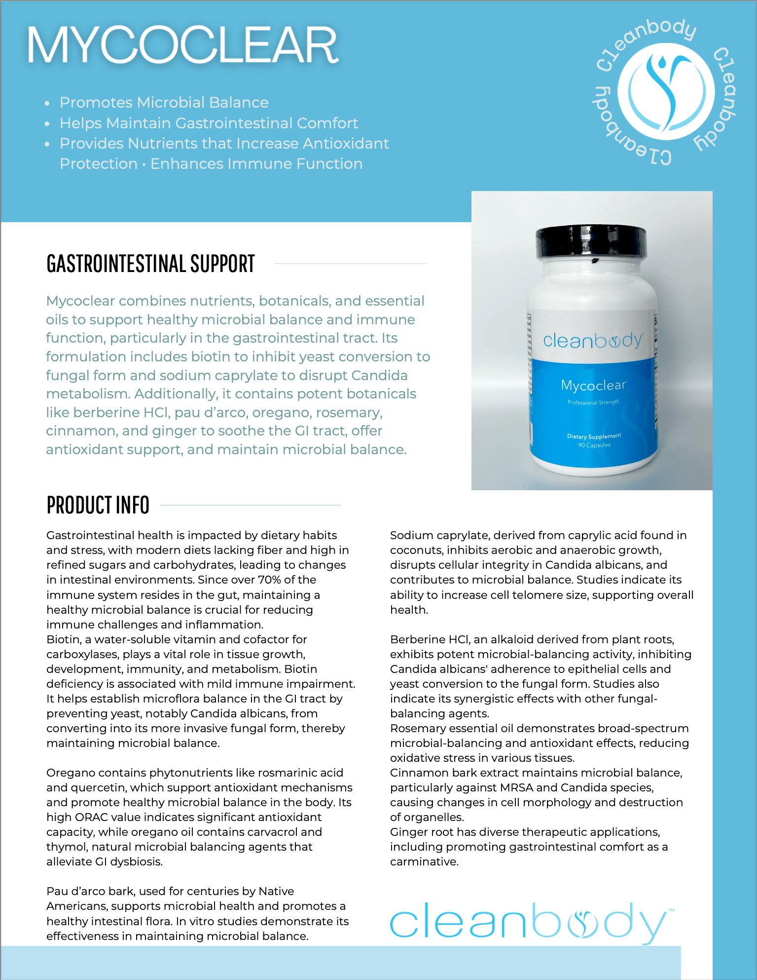 Using potent botanicals and essential oils, Mycoclear addresses microbial imbalances in the gut. Mycoclear can also inhibit candida from growing into a dangerous fungal form. Ingredients in this supplement help soothe your GI tract and promote gut balance and immune support.